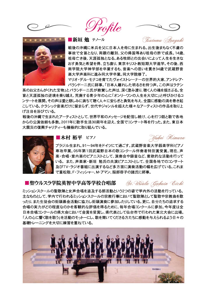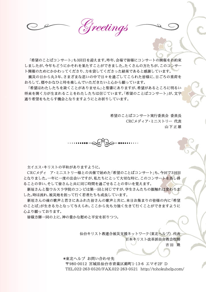 この番組から生まれた「希望のことばコンサート」は、新垣勉(テノール歌手)氏をはじめ多くの方のご協力を頂き、2012年、2013年、2014年3月に被災地にて開催することが出来ました。
